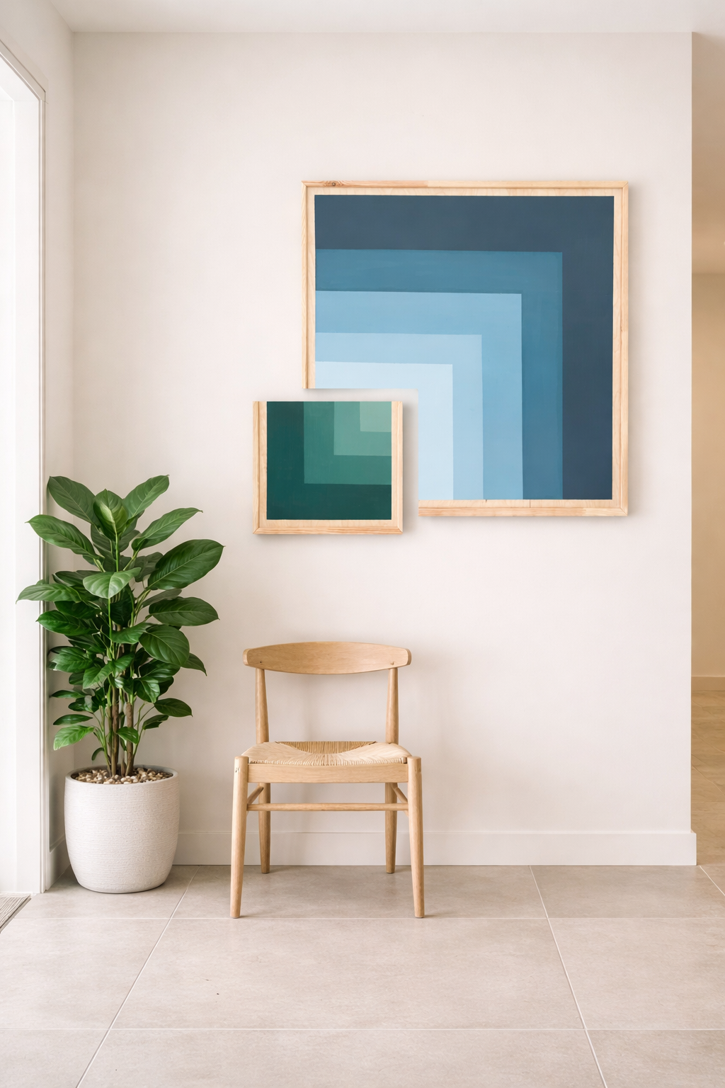 Dwuczęściowy obraz wykonany farbami akrylowymi na sklejce, o wymiarach ok. 80 x 80 cm.