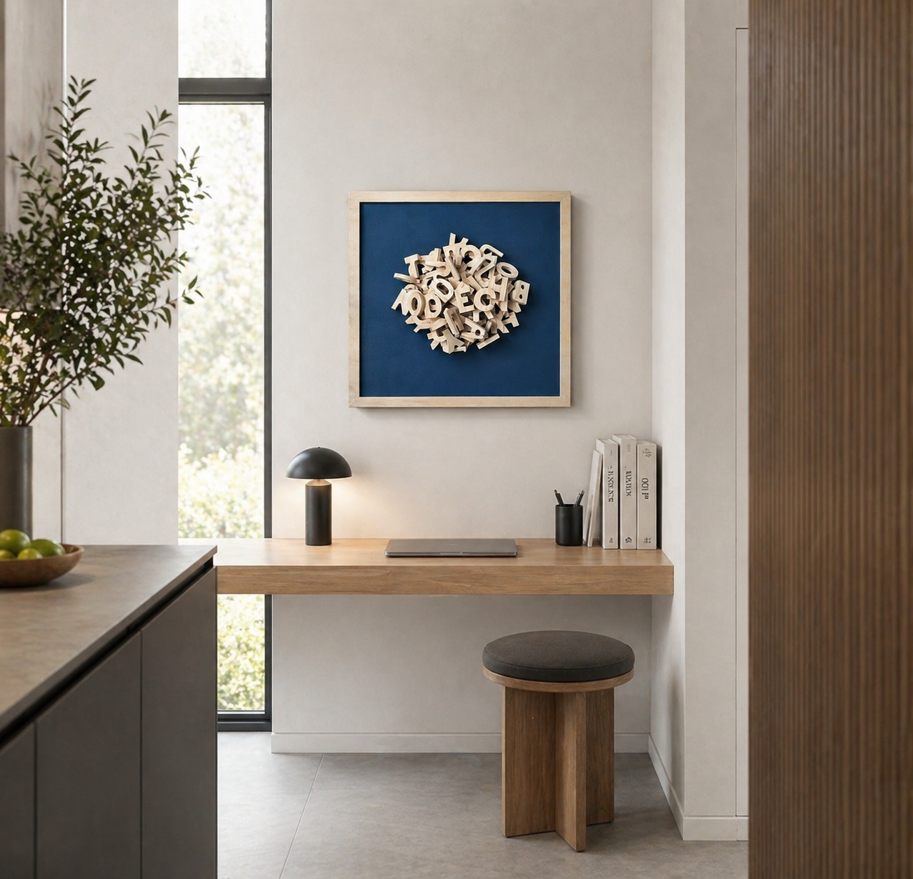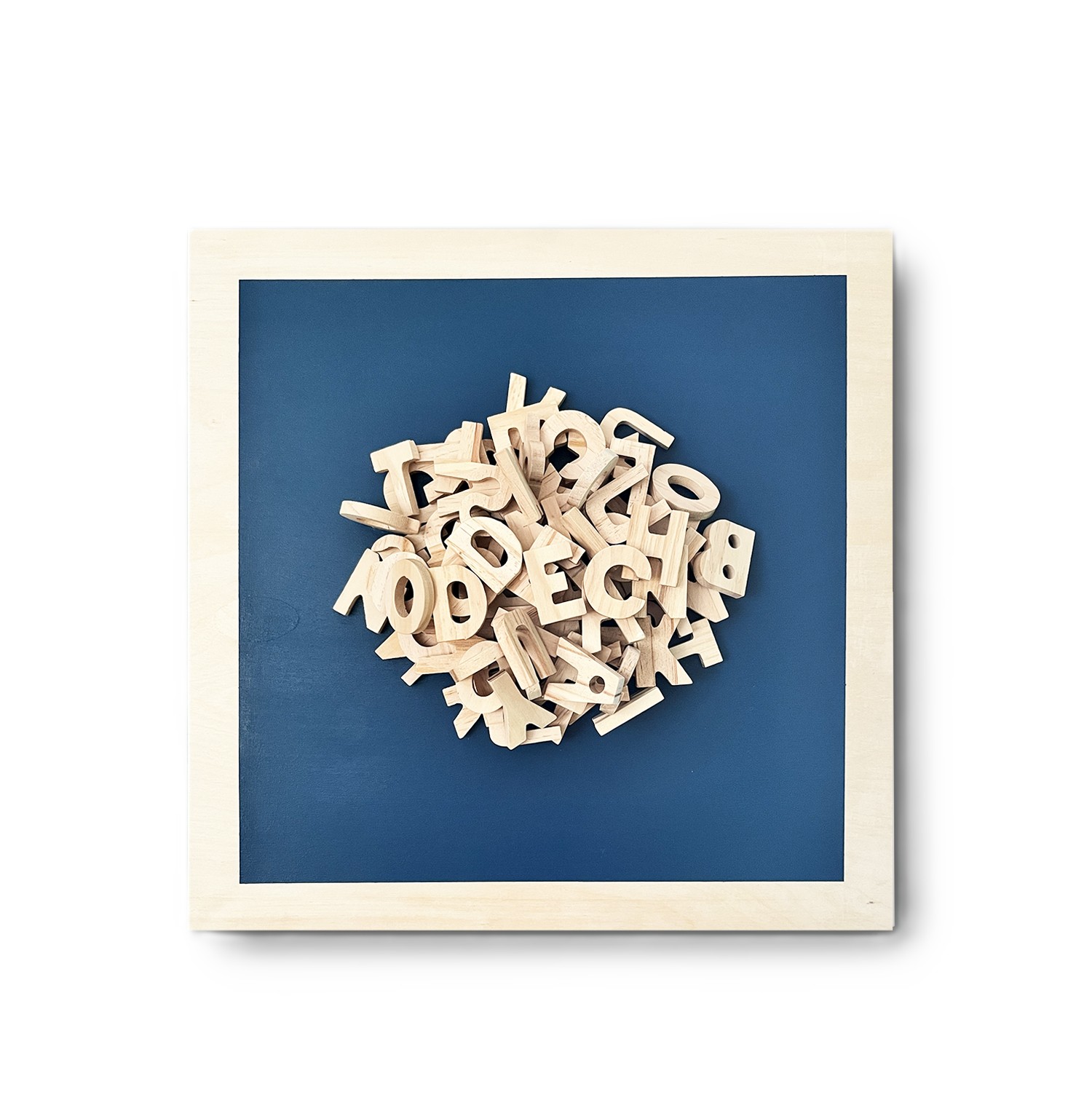Obraz przedstawia drewniane litery, usypane na środku uporządkowanej, spokojnej przestrzeni. Można to być nadmiar informacji – litery symbolizują słowa, które się mieszają i tracą sens w natłoku. Może to być proces tworzenia – zanim powstanie tekst, myśli są chaotyczne, jak te rozsypane znaki. Znaczenie ma tu materiał – Drewno daje wrażenie czegoś naturalnego i „namacalnego”, jakby język był czymś fizycznym, obciążającym a nie tylko abstrakcją.